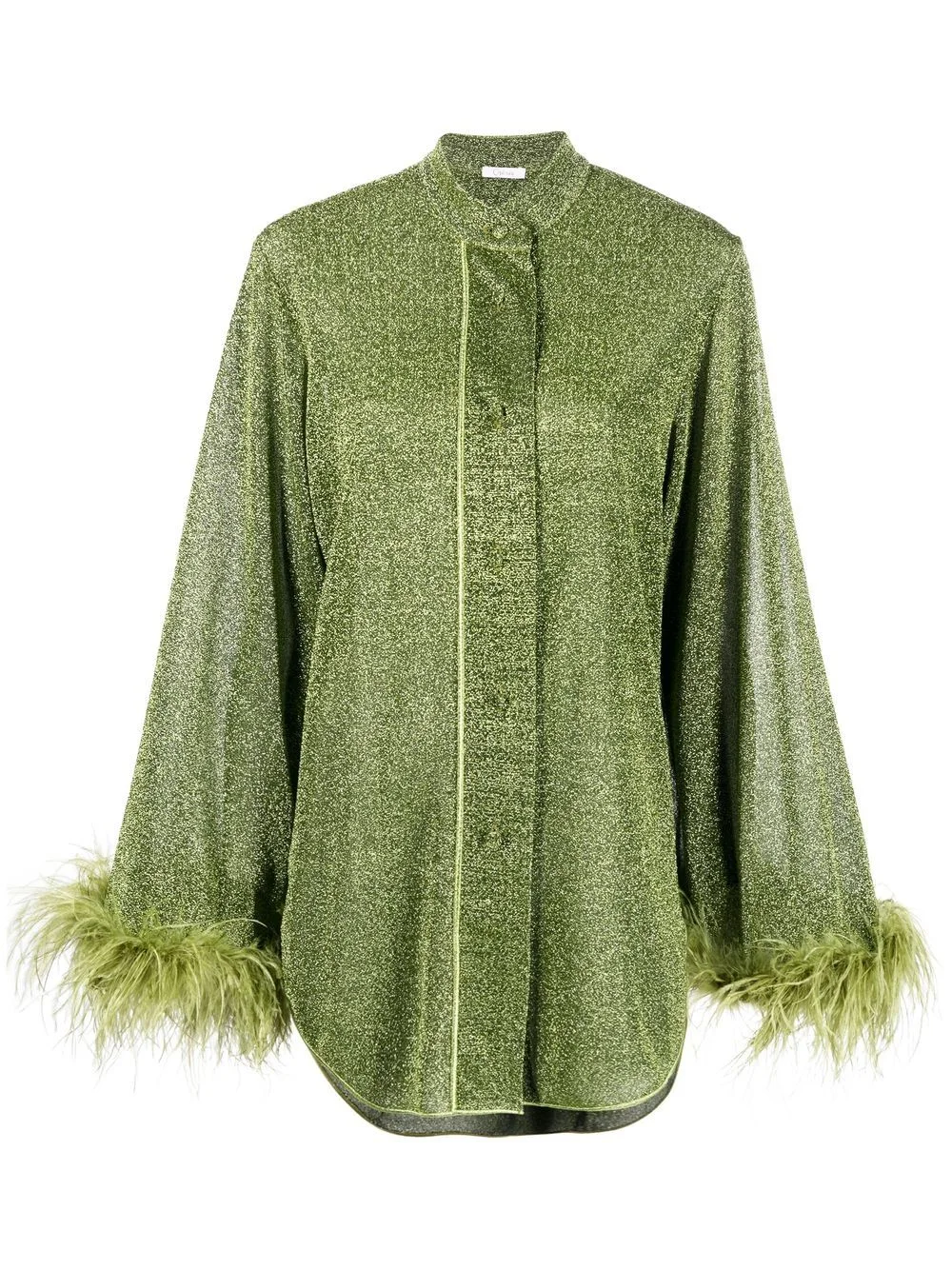 feather-trim blouse Renowned for its refined resort wear designs, Oseree presents the Lumiere shirt. In an olive green hue, the piece is finished with dazzling metallic threading and ostrich feather-trimmed cuffs. Made in Italy Composition Ostrich Feather 100%, Polyamide 64%, Metallic Fibre 36% Washing instructions Hand Wash