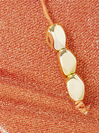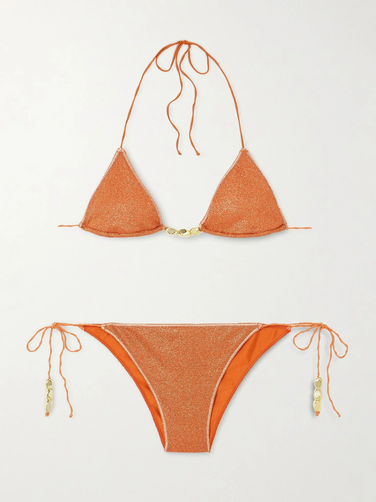 Oseree's 'Lumiere' bikini is flecked with metallic threads that give it a shimmery, 'Glazed' finish. It has triangle cups and low-rise briefs - both adorned with gold-tone beads. Use the adjustable straps to perfect the fit. Size & Fit - Fits true to size, take your normal size - Low-rise briefs with medium coverage - Model is 175cm/ 5'9", bra size 34A and is wearing a size Large Model measurements: - Bust: 89cm/ 35" - Waist: 74cm/ 29" - Hip: 109cm/ 43” Details & Care - Orange metallic stretch-polyamide - Top ties at neck and back, briefs tie at sides - 64% polyamide, 36% metallic fibers; lining: 80% polyamide, 20% elastane - Hand wash - Lotion, sunscreen, oil and chlorine can cause discoloration of this item; this is not a manufacturing defect. Please follow care instructions to keep your swimwear in the best condition