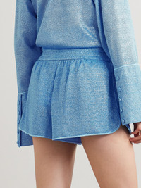 Oseree's 'Lumiere' shorts are named after the flecks of metallic threads that shimmer as they catch light. Made from stretch-knit, they sit high on the waist and have loose legs traced with tonal piping. Slip yours on over one of the label's bikinis. Size & Fit - Fits true to size, take your normal size - High-rise, cut for a loose fit - Elasticated at the waist for a comfortable fit - Mid-weight, stretchy fabric - Model is 177cm/ 5'10" and is wearing a size Small Model measurements: - Bust: 85cm/ 33” - Waist: 66cm/ 26” - Hip: 92cm/ 36” Details & Care - Light-blue metallic stretch-knit - Pull on - 64% polyamide, 36% metallic fibers - Unlined - Machine wash - Designer color: Crystal