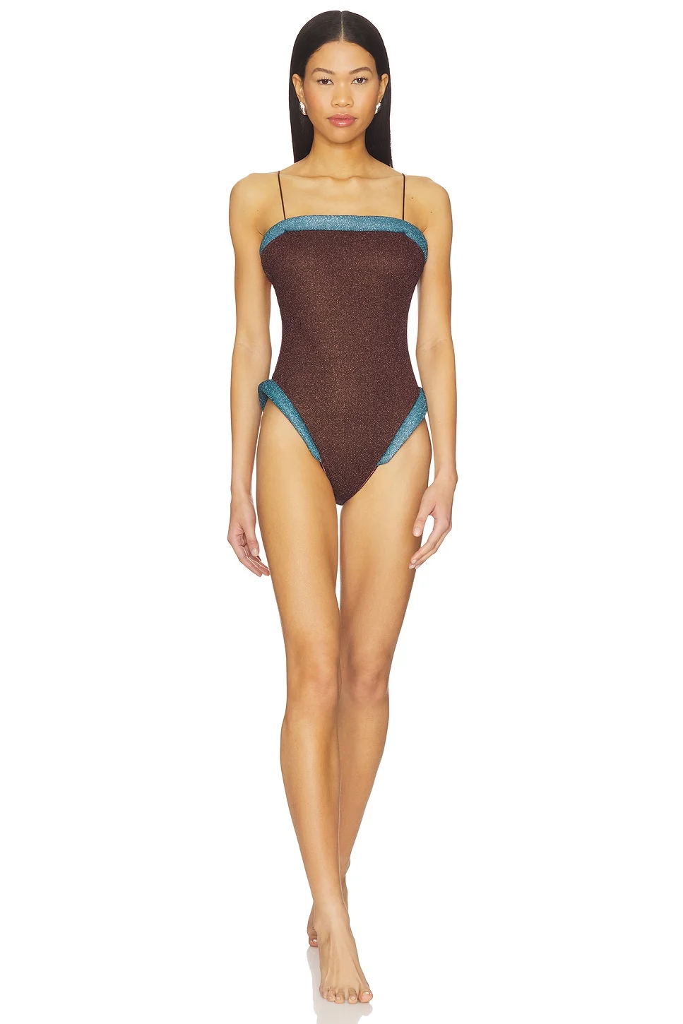 - Self: 64% polyamide 36% metallic fiber Lining: 80% polyamide 20% elastane - Made in Italy - Hand wash separately - Pull-on styling - Lightweight swimwear fabric with metallic threading - Padded trim - Revolve Style No. OSSE-WX155 - Manufacturer Style No. LUS261