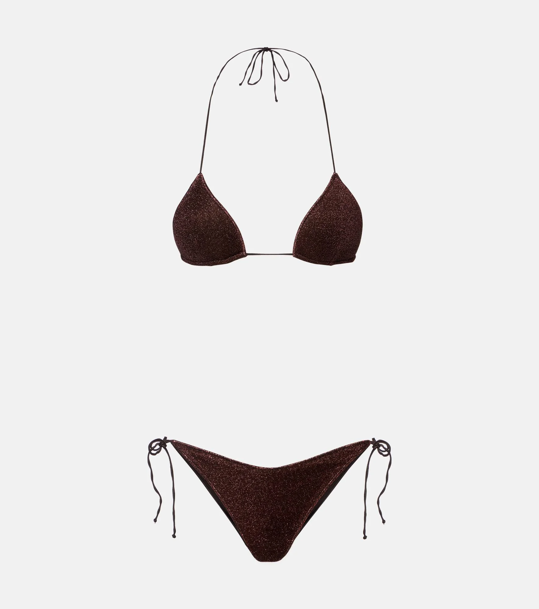 When the occasion calls for unforgettable stop-and-stare silhouettes, Oseree is the answer. The 80s bikini is made from the brand's iconic Lumiere fabric for a shimmering finish. Product Details - Material: 64% polyamide, 36% metallic fibres - Care instructions: hand wash - Made in Italy - Color: brown - Designer color name: Chocolate - Item color: brown - Two-piece set - Closure: self-ties - Padded cups - Lining: 80% polyamide, 20% elastane - Item number: P01136442 Size & Fit - Fits small to size - we recommend trying one size larger - Padded top - Minimal coverage - Medium-cut leg - The model seen in the picture is 178cm-5'10", cup size B, and wearing a size S