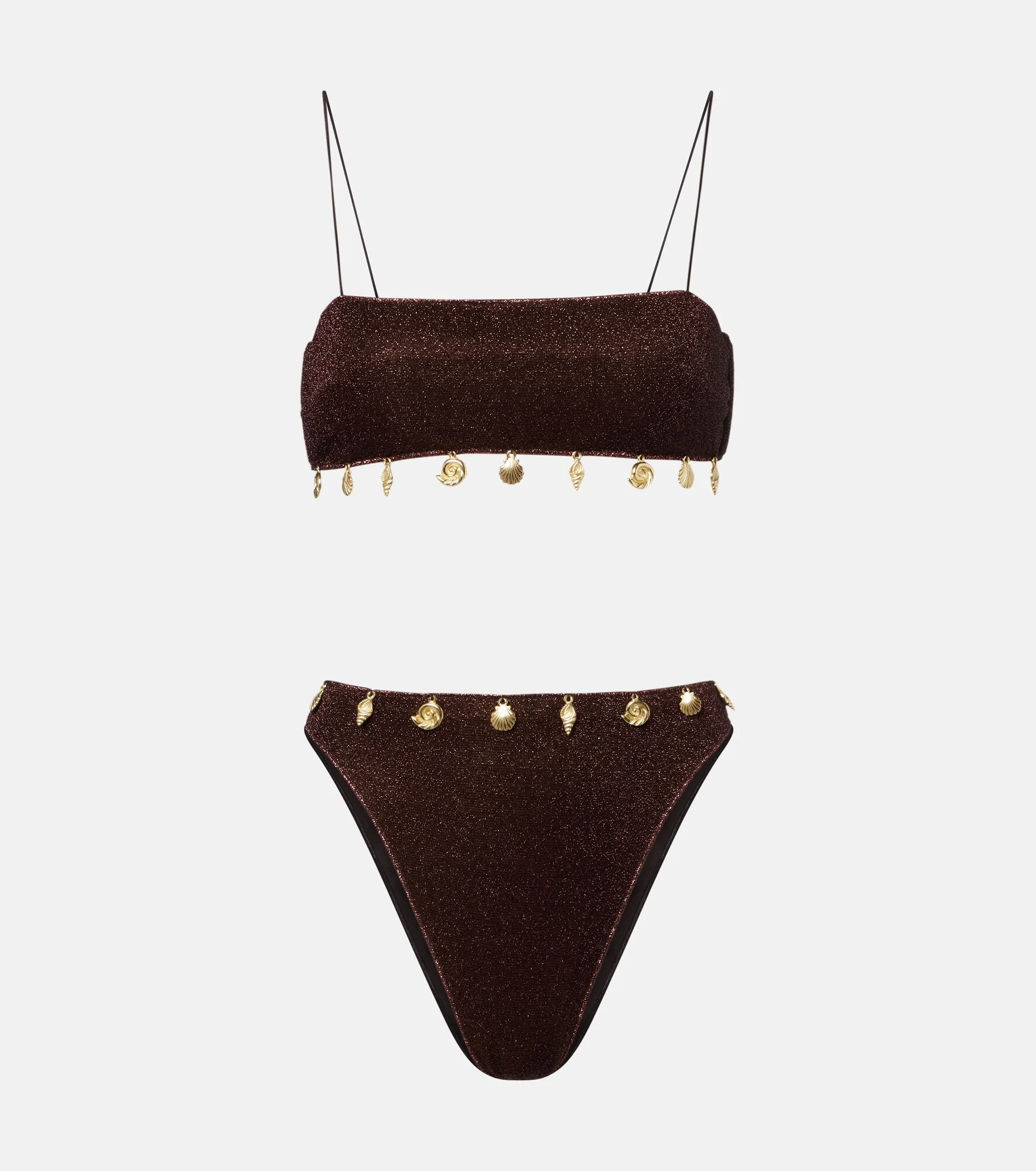 When the occasion calls for unforgettable stop-and-stare silhouettes, Oseree is the answer. Made from the signature Lumiere fabric, this bikini features a bandeau top and high-rise bottoms, both adorned with shell charms along the trims. Product Details - Material: 64% polyamide, 36% metallic fibres - Care instructions: hand wash - Made in Italy - Color: brown - Designer color name: Lurex Chocolate - Material II: 80% polyamide, 20% elastane - Closure: self-ties - Item number: P01170637 Size & Fit - True to size - Unpadded Top - Minimal coverage - Medium-cut leg - The model seen in the picture is 178cm-5'10", cup size B, and wearing a size S