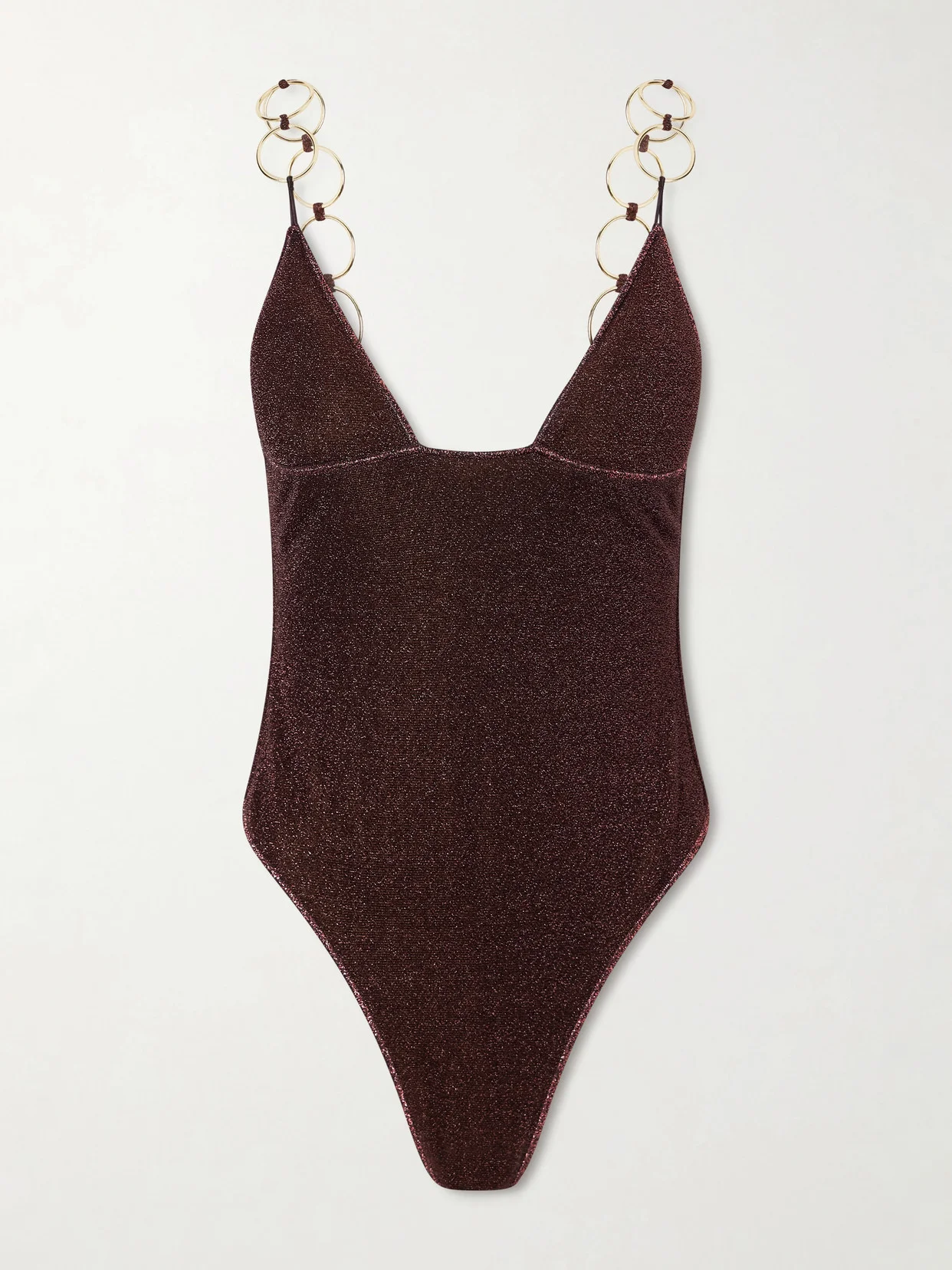 Oseree's 'Lumiere' swimsuit catches every ray of light with its shimmering finish. It's made from metallic stretch fabric with soft triangle cups held by interlinking gold-tone rings.