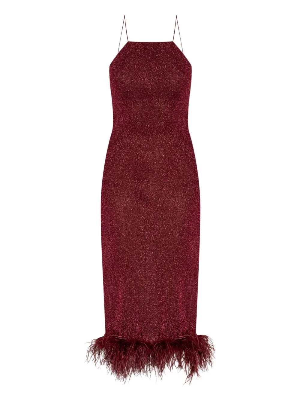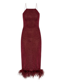 feather-trimmed sparkle midi dress Highlights - Burgundy - Spaghetti straps - Feather embellishment at hem - Shimmering effect - Square open back - Below knee-length Made in Italy Composition Ostrich Feather 100%, Lurex 100%, Polyamide 100%