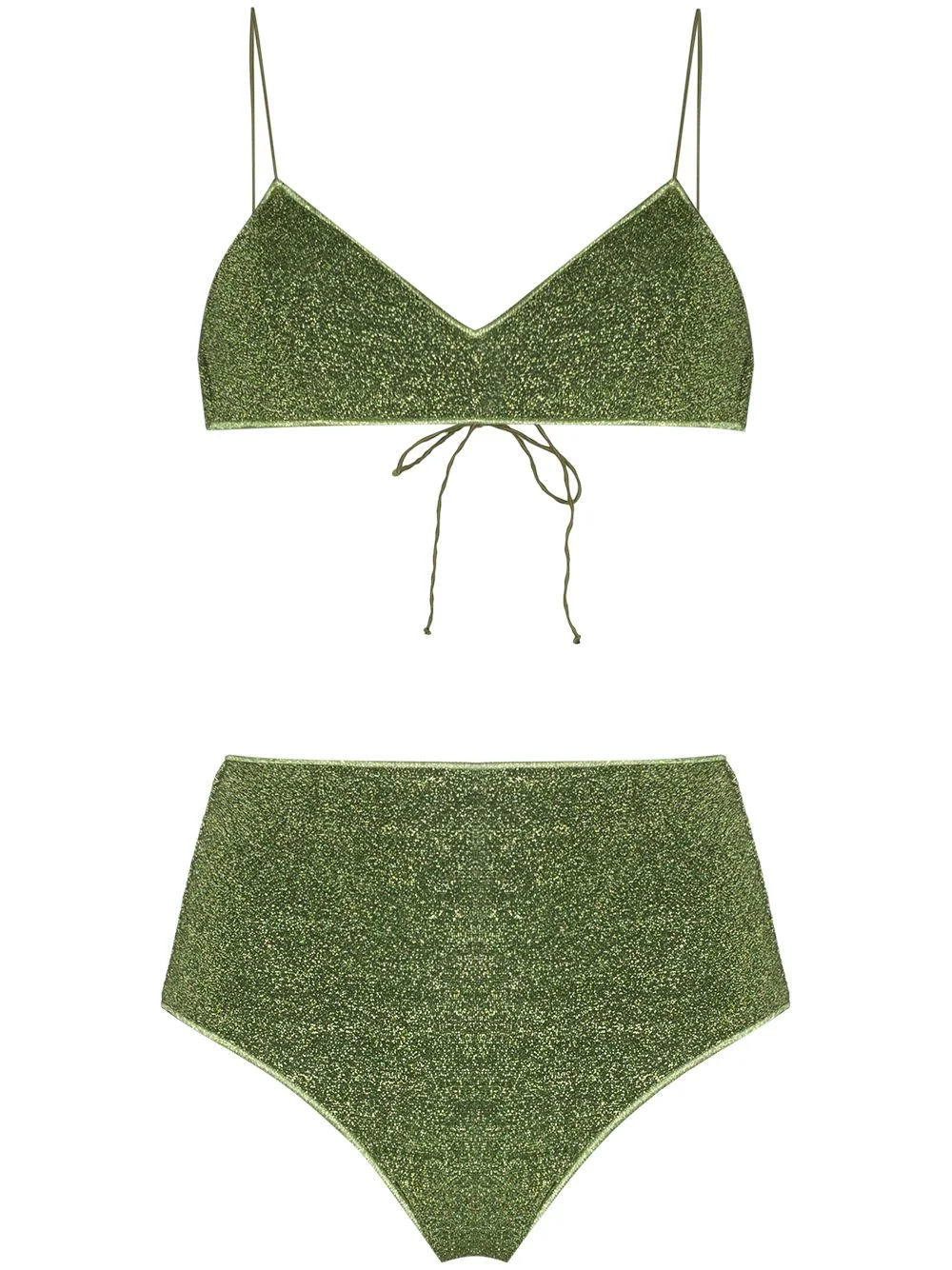 Lumiere lurex high-waisted bikini set Oseree adds a touch of glamour to their understated swimwear pieces by accenting them with glimmering details. Threaded with a lurex fibre for a sparkling effect, this two-piece bikini has high-waisted bottoms for timeless appeal. Made in Italy Composition Outer: Polyamide 64%, Metal 36% Lining: Polyamide 85%, Spandex/Elastane 15% Washing instructions Machine Wash
