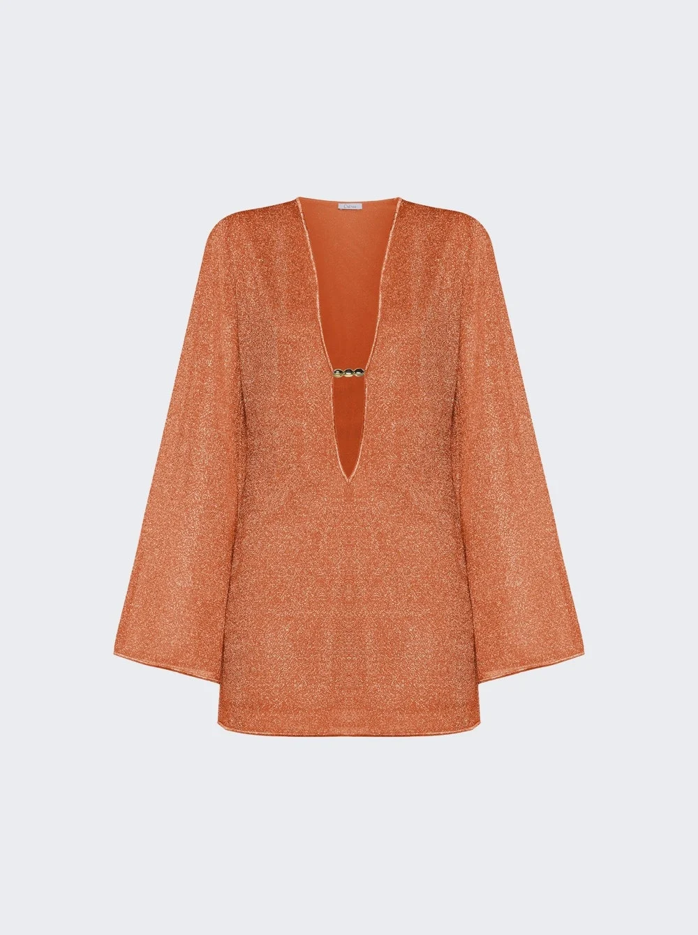 Details - Regular fit - Deep V-neck - Ring detail - Long flared sleeves - Metallic finish - Mini length - Care according to label - Material: 64% polyamide, 36% metallic fibres Size Information: Vendor Color Code: Brand Style: LZKF257 Designer/Brand: OSeREE
