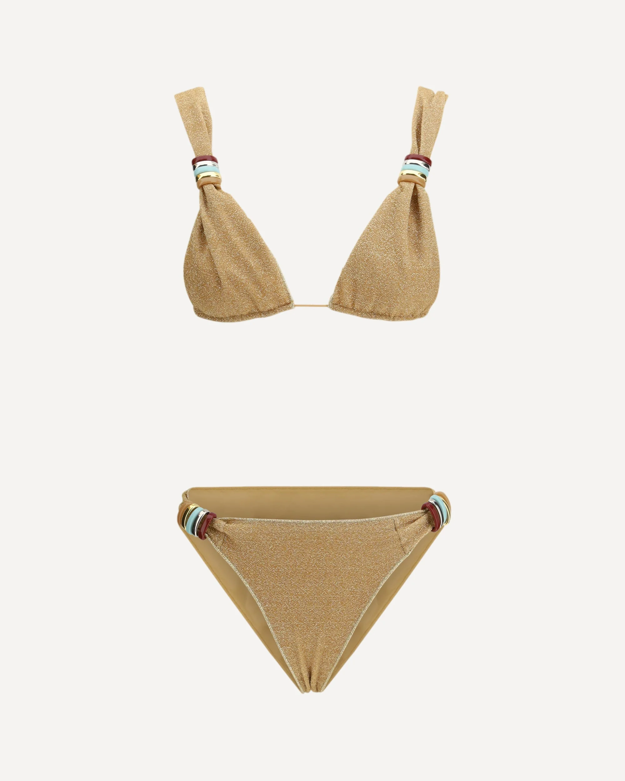 Il Lumiere Multi Ring Bikini di Oseree racchiude l’essenza audace e gioiosa del brand in un design scultoreo e decisamente glamour. Il due pezzi e caratterizzato da una sequenza di anelli multicolore fissi che uniscono le parti scintillanti con rigore architettonico, definendo la silhouette e lasciando intravedere la pelle con eleganza. Il contrasto tra il tessuto luminoso e le note vivaci degli anelli dona al set un carattere contemporaneo e artistico, trasformandolo in un capo di forte impatto. DETAILS - Sku: AKS261_GOLD - Season: SS26 - Fit: Slim - Composition: GENERAL 64% Polyamide 36% Other Fibres - MADE IN ITALY