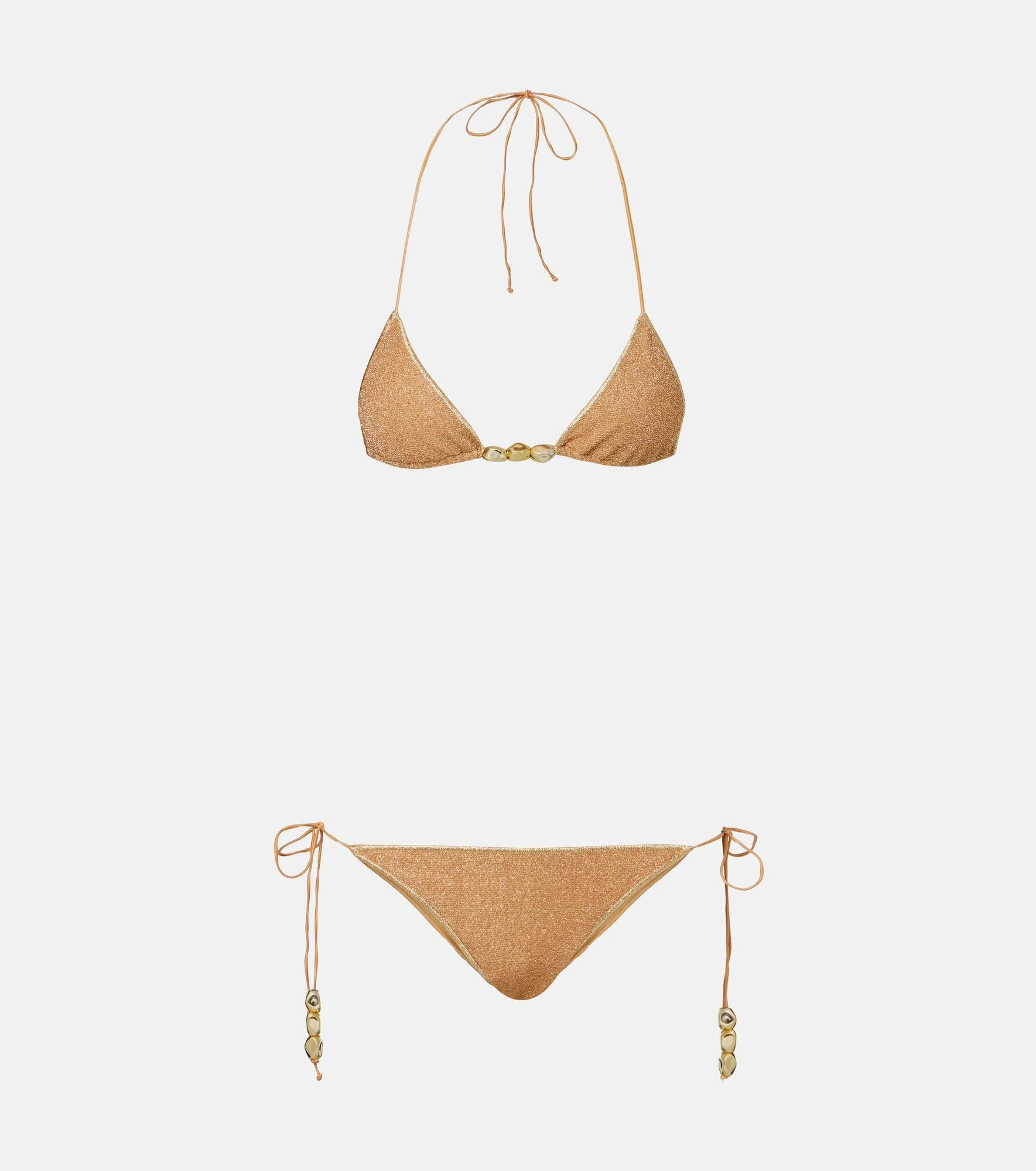 When the occasion calls for unforgettable stop-and-stare silhouettes, Oseree is the answer. The Lumiere Nuggets bikini is made from an iteration of the brand's iconic shimmery fabric. Product Details - Material: 64% polyamide, 36% metallic fibres - Care instructions: hand wash - Made in Italy - Designer color name: Gold - Item color: gold - Hardware color: gold - Lining: 80% polyamide, 20% elastane - Closure: self-ties - Item number: P01078655 Size & Fit - Fits small to size - we recommend trying one size larger - Unpadded Top - Minimal coverage - Medium-cut leg - The model seen in the picture is 178cm-5'10", cup size B, and wearing a size S