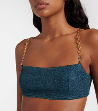 Primed for sunny getaways and beyond, this bikini features the brand's signature O Chain detailing at the shoulder straps. This piece is made with Oseree’s Lumiere fabric, which is threaded with very fine metallic strands to achieve a unique shimmering finish. Product Details - Material: 64% polyamide, 36% metallic fibres - Care instructions: hand wash - Made in Italy - Color: blue - Designer color name: Peacock - Item color: green, gold - Two-piece set - Includes: garment bag - Lining: 80% polyamide, 20% elastane - Item number: P01136434 Size & Fit - True to size - High-waisted - Cup size: A/B - Unpadded Top - High-cut leg - The model seen in the picture is 178cm-5'10", cup size B, and wearing a size S