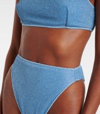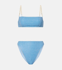 Primed for sunny getaways and beyond, this bikini features the brand's signature O Chain detailing at the shoulder straps. This piece is made with Oseree’s Lumiere fabric, which is threaded with very fine metallic strands to achieve a unique shimmering finish. Product Details - Material: 64% polyamide, 36% metallic fibres - Care instructions: hand wash - Made in Italy - Designer color name: Crystal - Item color: blue - Lining: 80% polyamide, 20% elastane - Hardware color: gold - Two-piece set - High-rise - Item number: P01078630 Size & Fit - True to size - High-waisted - Cup size: A/B - Unpadded Top - High-cut leg - The model seen in the picture is 178cm-5'10", cup size B, and wearing a size S