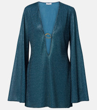 This piece is made with Oseree’s Lumiere fabric, which is threaded with very fine metallic strands to achieve a unique shimmering finish. The sparkling minidress features a deep neckline accented with ring-shaped hardware. Product Details - Material: 64% polyamide, 36% metallic fibres - Care instructions: hand wash - Made in Italy - Color: blue - Designer color name: Peacock - Lining: 80% polyamide, 20% elastane - Hardware color: gold - Item number: P01136436 Size & Fit - True to size - Cinched waist - Stretchy fabric - The model seen in the picture is 178cm-5'10" and wearing a size XS