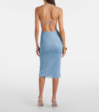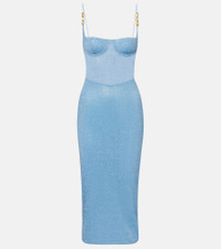 Made to stun, this midi dress comes with underwired cups, embellished spaghetti straps, and an open-back silhouette. This piece is made with Oseree’s Lumiere fabric, which is threaded with very fine metallic strands to achieve a unique shimmering finish. Product Details - Material: 64% polyamide, 36% metallic fibres - Care instructions: hand wash - Made in Italy - Designer color name: Crystal - Item color: blue - Lining: 80% polyamide, 20% elastane - Hardware color: gold - Self-tie back - Underwired cups - Fully lined - Item number: P01078660 Size & Fit - True to size - Low back - Fitted - Stretchy fabric - Underwired top - If you wear a C cup or bigger, we recommend trying one size larger - The model seen in the picture is 178cm-5'10" and wearing a size S