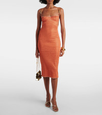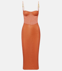 Made to stun, this midi dress comes with underwired cups, embellished spaghetti straps, and an open-back silhouette. This piece is made with Oseree’s Lumiere fabric, which is threaded with very fine metallic strands to achieve a unique shimmering finish. Product Details - Material: 64% polyamide, 36% metallic fibres - Care instructions: hand wash - Made in Italy - Designer color name: Orange - Item color: orange - Hardware color: gold - Lining: 82% polyamide, 18% elastane - Self-tie back - Underwired cups - Fully lined - Item number: P01078643 Size & Fit - True to size - Low back - Fitted - Stretchy fabric - Underwired top - If you wear a C cup or bigger, we recommend trying one size larger - The model seen in the picture is 178cm-5'10" and wearing a size S