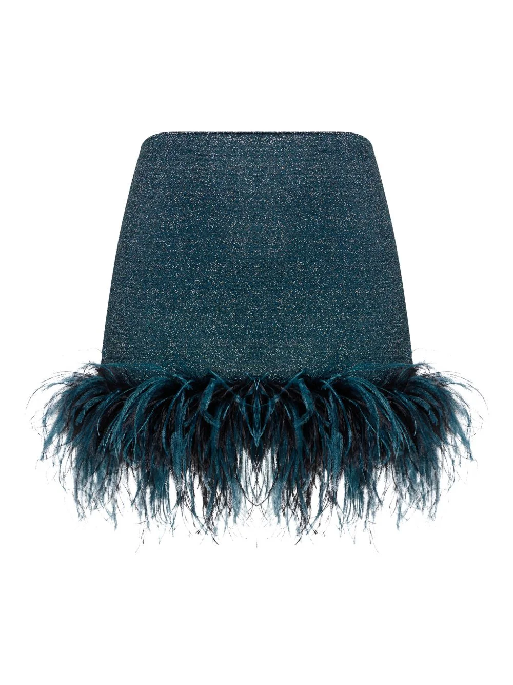 Lumiere Plumage mini skirt Highlights - Blue - Feather trim - High waist Imported Composition Fabric 100%, Feather 100% Washing instructions Read Manufacturer Guidelines