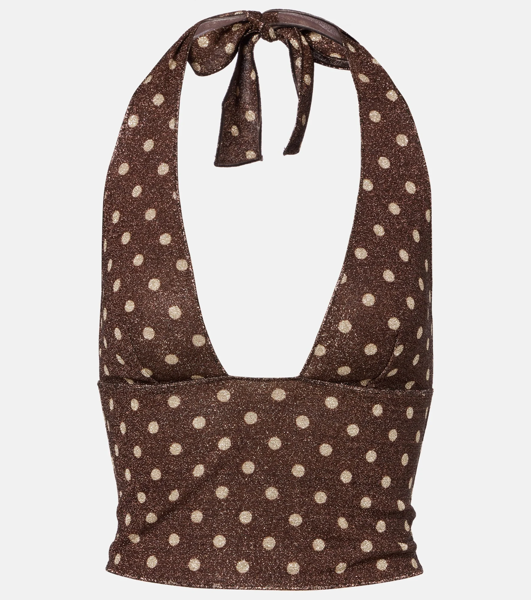 This Oseree polka-dot crop top is designed with a plunging front and a self-tie halterneck. The piece is made with the signature Lumiere fabric, which is threaded with very fine metallic strands to achieve a unique shimmering finish. Product Details - Material: 64% polyamide, 36% metallic fibres - Care instructions: hand wash - Made in Italy - Color: brown - Designer color name: Brown Platinum Pois - Self-tie neck - Lining: 80% polyamide, 20% elastane - Item number: P01170615 Size & Fit - Fits small to size - we recommend trying one size larger - Low back - Fitted - Slightly stretchy fabric - Cropped - The model seen in the picture is 178cm-5'10" and wearing a size S