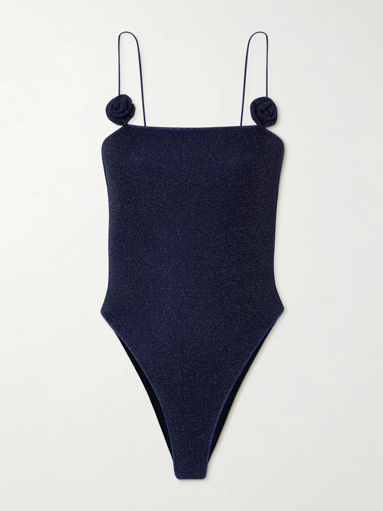 Oseree's 'Lumiere' swimsuit has an eye-catching metallic finish and rose appliques, setting it apart from more traditional swimwear. It's designed with pin-thin straps, a square neckline and high-cut legs. Wear it by the pool or style it with a mini skirt for late-night parties.