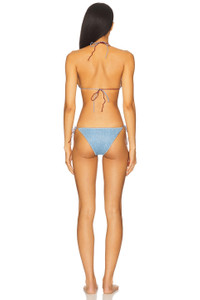 - Self: 64% polyamide 36% metallic fibers Lining: 80% polyamide 20% elastane - Hand wash - Unpadded cups - Halterneck and back tie closure Side tie closures - Front glass shell accent - Bikini back - Midweight metallic swimwear fabric - Revolve Style No. OSSE-WX150 - Manufacturer Style No. LSMF257