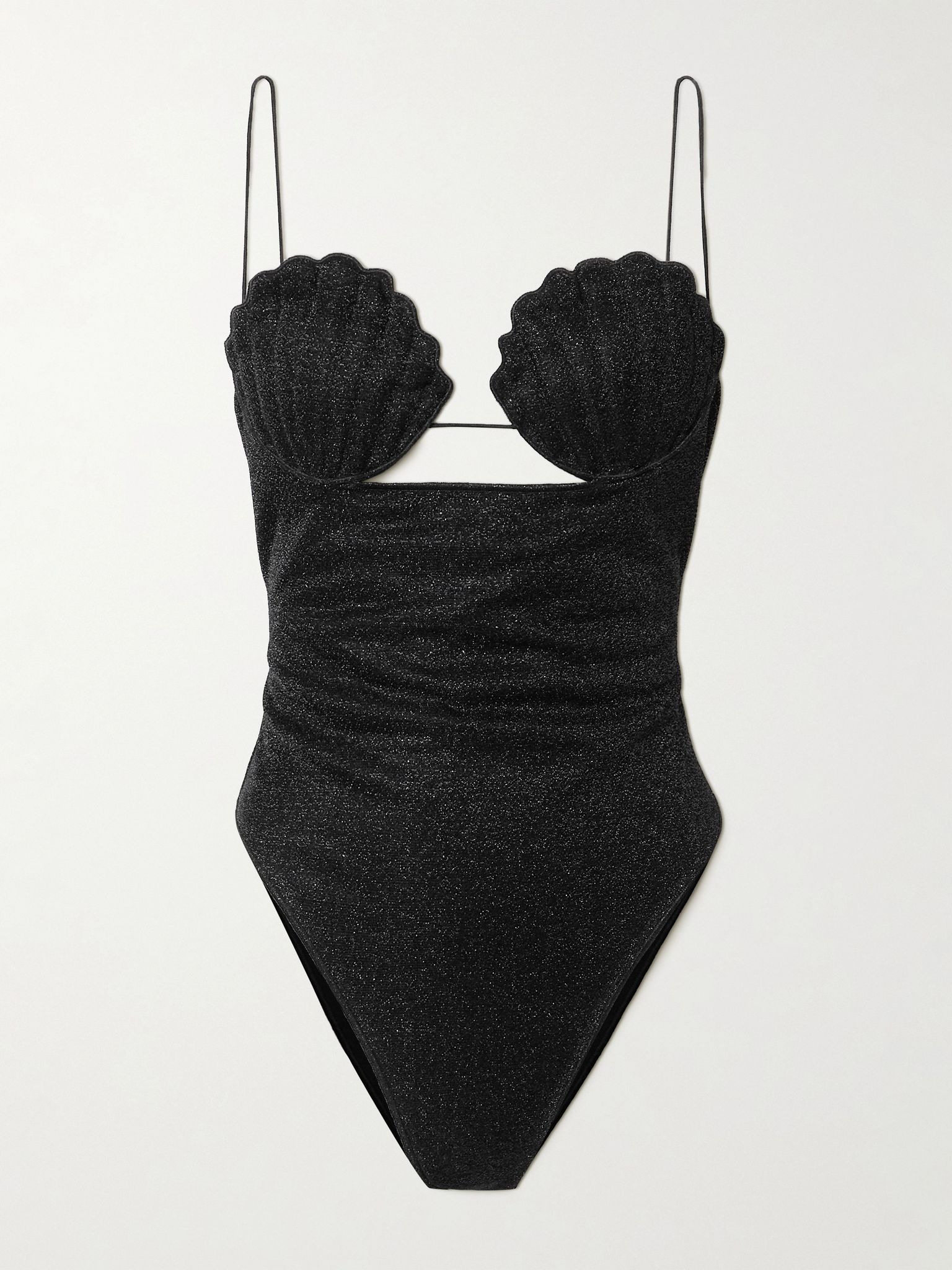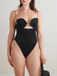 Oseree's 'Lumiere' swimsuit is defined by playful shell-shaped cups. It's made from Lurex that shimmers in the sun and has a center cutout and pin-thin straps. Size & Fit - Fits true to size, take your normal size - Minimal brief coverage - Model is 175cm/ 5'9", bra size 34A and is wearing a size Large Model measurements: - Bust: 89cm/ 35" - Waist: 74cm/ 29" - Hip: 109cm/ 43” Details & Care - Black Lurex - Pulls on - 64% polyamide, 36% metallic fibers; lining: 82% polyamide, 18% elastane - Machine wash - Lotion, sunscreen, oil and chlorine can cause discoloration of this item; this is not a manufacturing defect. Please follow care instructions to keep your swimwear in the best condition
