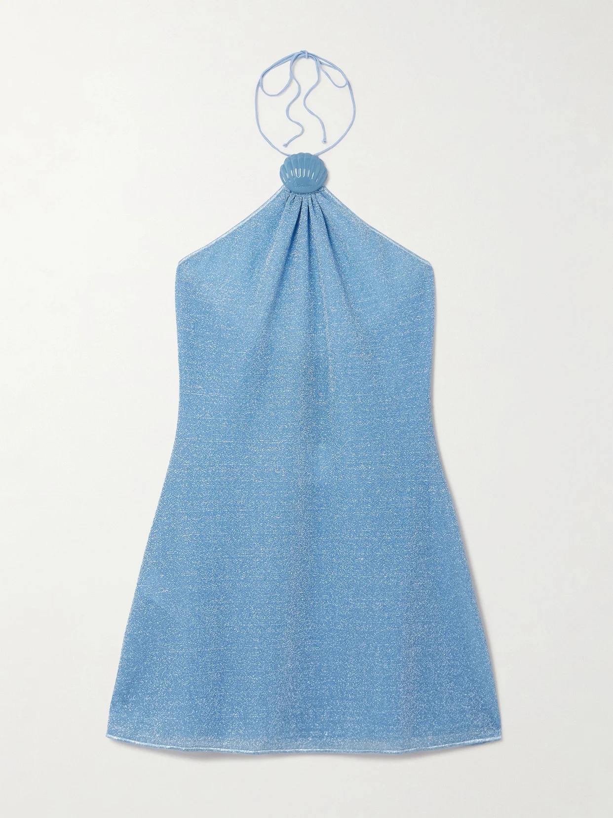 The halter neckline of Oseree's 'Lumiere' dress is gathered by a tonal shell embellishment engraved with the label's logo. It's made from stretch-knit flecked with shimmering metallic threads and has an alluring open back. Wear yours with strappy heels.