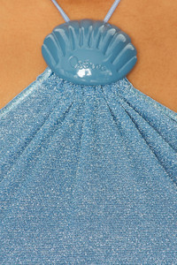 Details - Self: 64% polyamide, 36% metallized fibers - Lining: 82% polyamide, 18% elastane - Hand wash - Fully lined - Pull-on styling - Halterneck styling with tie closure - Front glass shell accent - Lightweight metallic jersey fabric - Made in Italy - Our Style No. OSEF-WD42 - Manufacturer Style No. LSKF257