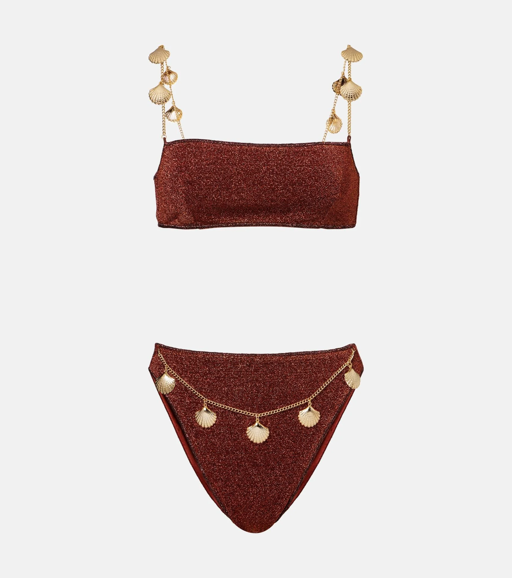 This bikini is made with Oseree’s Lumiere fabric, which is threaded with very fine metallic strands to achieve a unique shimmering finish. It's a belted piece embellished with seashells. Product Details - Material: 80% polyamide, 20% elastane - Care instructions: machine wash at 30 degrees - Made in Italy - Designer color name: Brown - Item color: brown - Item number: P01042152 Size & Fit - Fits small to size - we recommend trying one size larger - Unpadded Top - High-cut leg - The model seen in the picture is 178cm-5'10", cup size B, and wearing a size S