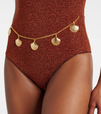 This piece is made with Oseree’s Lumiere fabric, which is threaded with very fine metallic strands to achieve a unique shimmering finish. It's a belted piece embellished with seashells. Product Details - Material: 64% polyamide, 36% metallic fibres - Care instructions: machine wash at 30 degrees - Made in Italy - Designer color name: Brown - Item color: brown - Lining: 80% polyamide, 20% elastane - Hardware color: gold - Item number: P01042153 Size & Fit - Fits small to size - we recommend trying one size larger - Unpadded Top - High-cut leg - The model seen in the picture is 178cm-5'10", cup size B, and wearing a size S