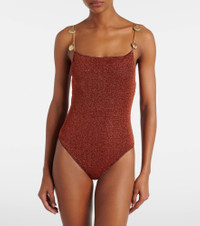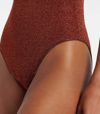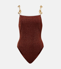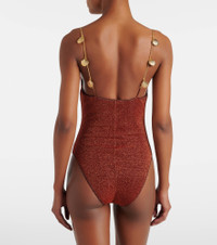 This swimsuit is made with Oseree’s Lumiere fabric, which is threaded with very fine metallic strands to achieve a unique shimmering finish. It hangs from straps embellished with seashells. Product Details - Material: 64% polyamide, 36% metallic fibres - Care instructions: machine wash at 30 degrees - Made in Italy - Designer color name: Brown - Item color: brown - Lining: 80% polyamide, 20% elastane - Item number: P01042154 Size & Fit - Fits small to size - we recommend trying one size larger - Unpadded Top - High-cut leg - The model seen in the picture is 178cm-5'10", cup size B, and wearing a size S