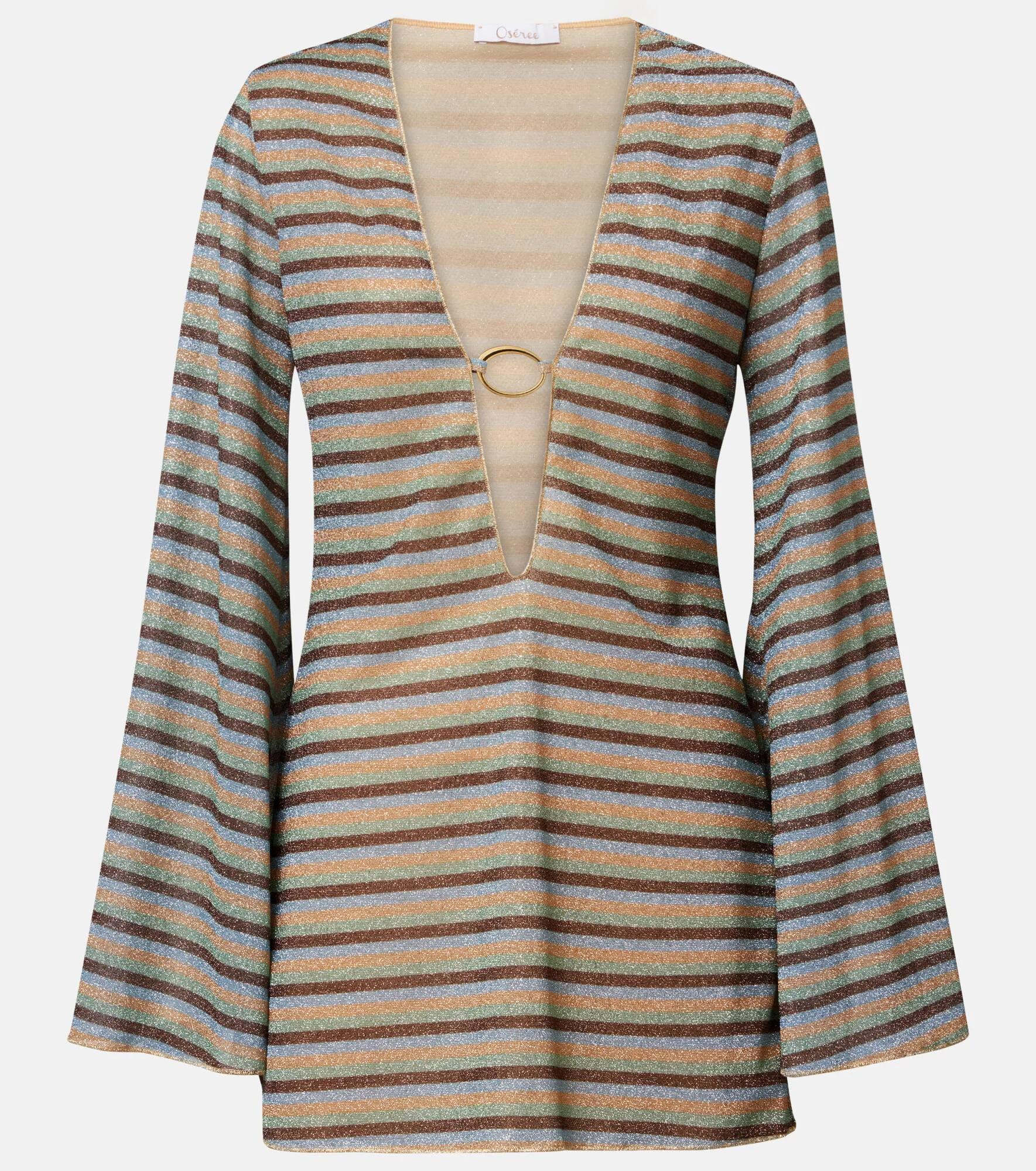 Boasting a striped motif, this minidress features a deep neckline detailed with ring-shaped hardware. The style is made with Oseree’s Lumiere fabric, which is threaded with very fine metallic strands to achieve a unique shimmering finish. Product Details - Material: 64% polyamide, 36% metallic fibres - Care instructions: hand wash - Made in Italy - Color: multicoloured - Designer color name: Aqua Multicolor - Lining: 80% polyamide, 20% elastane - Hardware color: gold - Item number: P01139506 Size & Fit - True to size - Cinched waist - Stretchy fabric - The model seen in the picture is 178cm-5'10" and wearing a size S