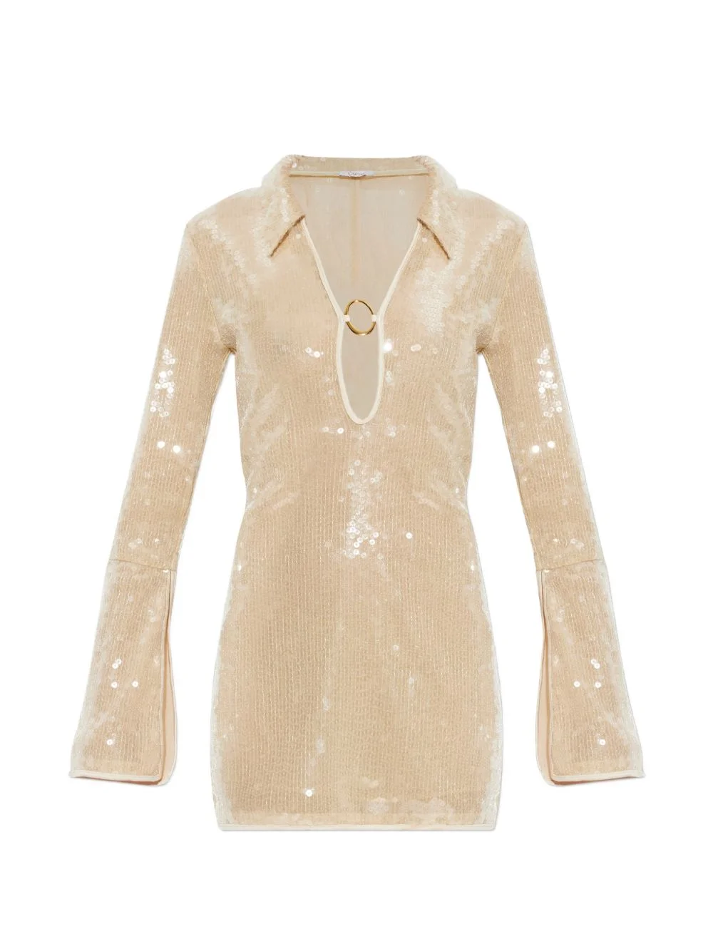 sequined mini dress Highlights - Light beige - Sequin embellishment - Plunging v-neck - Long sleeves - Gold-tone ring detail Made in Italy Composition Polyester 100% Washing instructions Read Manufacturer Guidelines