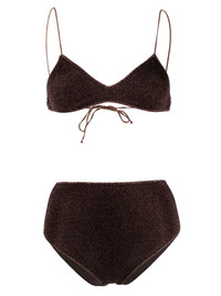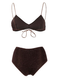 metallic-detail two-piece bikini chocolate brown metallic threading spaghetti straps rear tie fastening high-waisted bottoms Be mindful to try on swimwear over your own garments. Made in Italy Composition Outer: Polyamide 64%, Metallic Fibre 36% Lining: Polyamide 85%, Spandex/Elastane 15% Washing instructions Machine Wash
