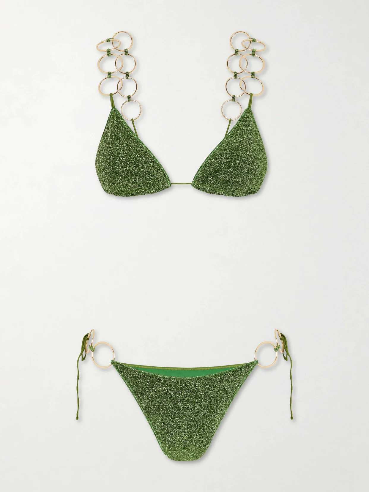 Ring hardware adds a glamorous jewelry-inspired element to Oseree's 'Lumiere' bikini. Flecked with light-catching metallic threads, it has triangle cups and coordinating briefs that offer minimal coverage. Wear it to the beach with one of the label's pareo's.
