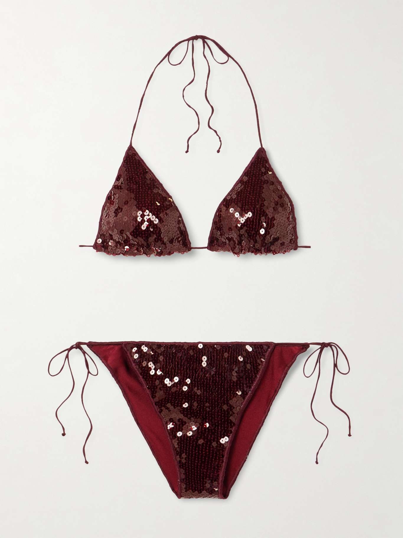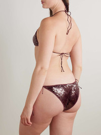 EDITORS'NOTES Oseree says it's 'Marilyn Microkini' is "tiny in size, huge in impact". It's covered in shimmering sequins and has triangle cups and low-rise briefs, both finished with pin-thin straps. SIZE & FIT Model measurements: - Fits true to size, take your normal size - Low-rise briefs with medium coverage - Model is 175cm/ 5'9", bra size 34A and is wearing a size Large - Bust: 89cm/ 35" - Waist: 74cm/ 29" - Hip: 109cm/ 43” DETAILS & CARE - Burgundy sequined polyester - Top ties at neck and back, briefs tie at sides - 100% polyester; lining: 80% polyamide, 20% elastane - Hand wash - Lotion, sunscreen, oil and chlorine can cause discoloration of this item; this is not a manufacturing defect. Please follow care instructions to keep your swimwear in the best condition