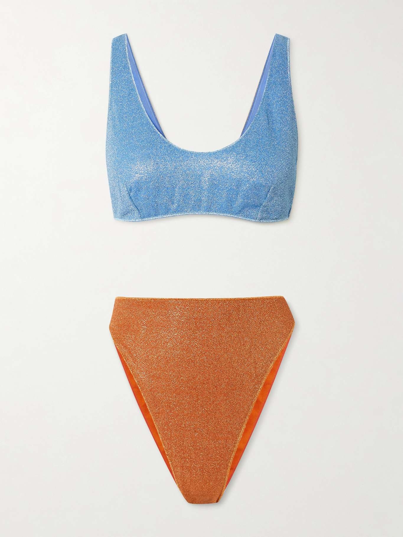 Oseree’s 'Glazed' bikini channels '90s nostalgia with its minimalist cut and bold attitude. It has a two-tone design with a blue top and orange high-rise briefs. The metallic finish beautifully catches the light. Size & Fit - Fits true to size, take your normal size - High-rise briefs with medium coverage - Model is 175cm/ 5'9" and is wearing a size Small Model measurements: - Bust: 80cm/ 31.5" - Waist: 66cm/ 26” - Hip: 95cm/ 37.5” Details & Care - Blue and orange metallic strech-polyamide - Slips on - 64% polyamide, 36% metallic fibers; lining: 80% polyamide, 20% elastane - Machine wash - Lotion, sunscreen, oil and chlorine can cause discoloration of this item; this is not a manufacturing defect. Please follow care instructions to keep your swimwear in the best condition