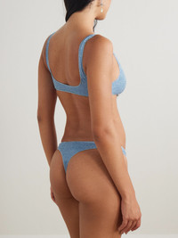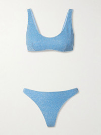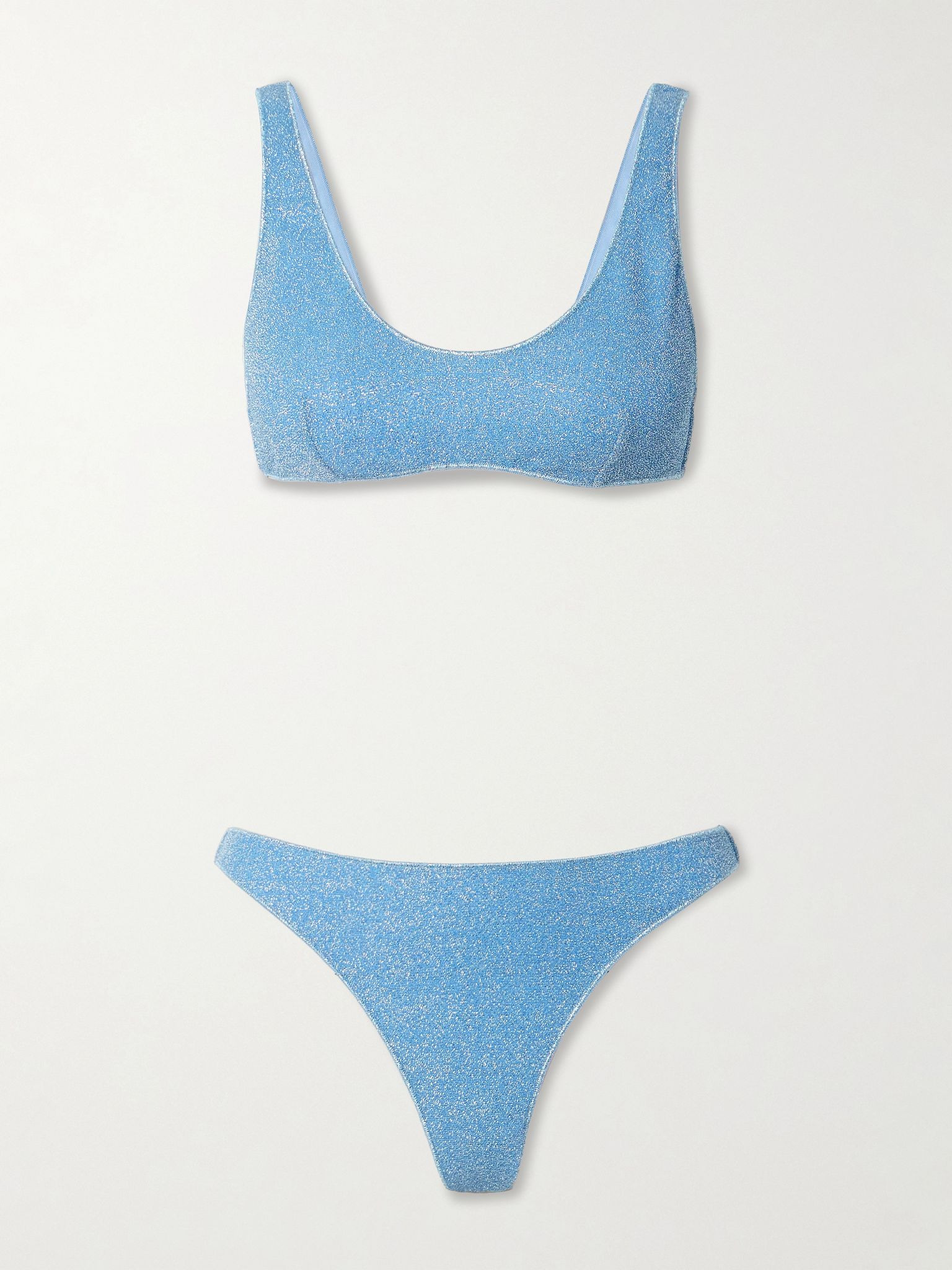 Oseree's bikini is made from stretch fabric with a metallic finish, calling to mind turquoise water glittering in the sun. The top is free from padding and underwiring, while the medium-coverage briefs have high-cut legs for an elongating effect. Size & Fit - Fits true to size, take your normal size - Mid-rise briefs with minimal coverage - Model is 177cm/ 5'10", bra size 32D and is wearing a size Small Model measurements: - Bust: 85cm/ 33.5" - Waist: 66cm/ 26" - Hip: 97cm/ 38" Details & Care - Light-blue metallic stretch-polyamide - Slips on - 64% polyamide, 36% metallic fibers; lining: 80% polyamide, 20% elastane - Machine wash - Lotion, sunscreen, oil and chlorine can cause discoloration of this item; this is not a manufacturing defect. Please follow care instructions to keep your swimwear in the best condition