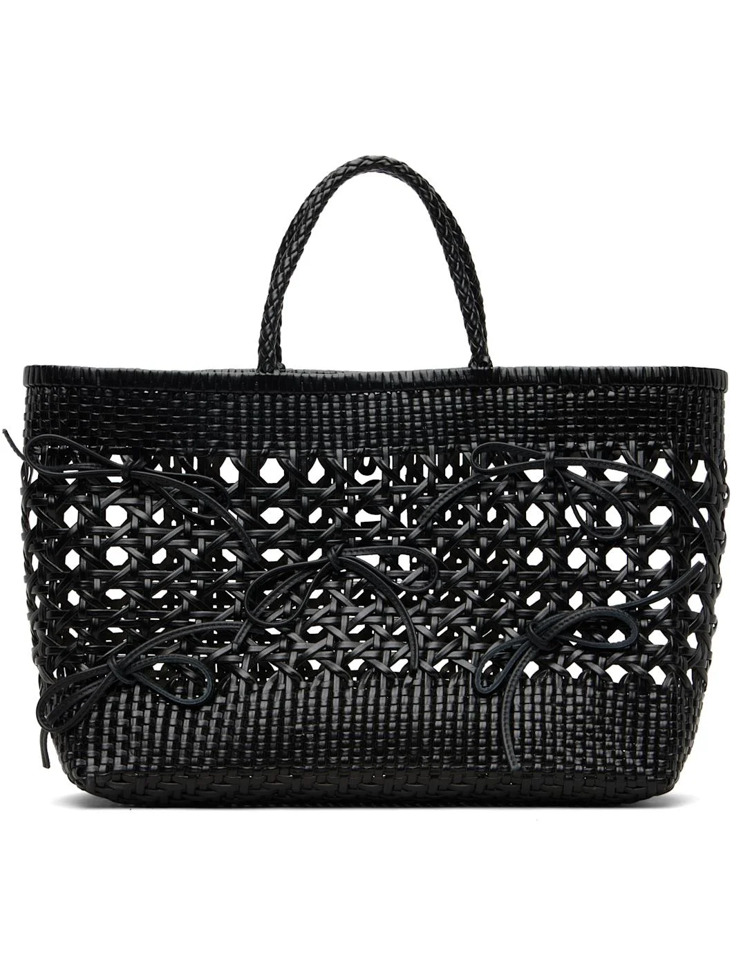 Basket-woven recycled leather tote. · Handcrafted · Fixed carry handles · Self-tie bow detailing at face · Open throat · Unlined · H10" x W16.25" x D4" Supplier color: Black 100% recycled leather. Made in China 261811F049003