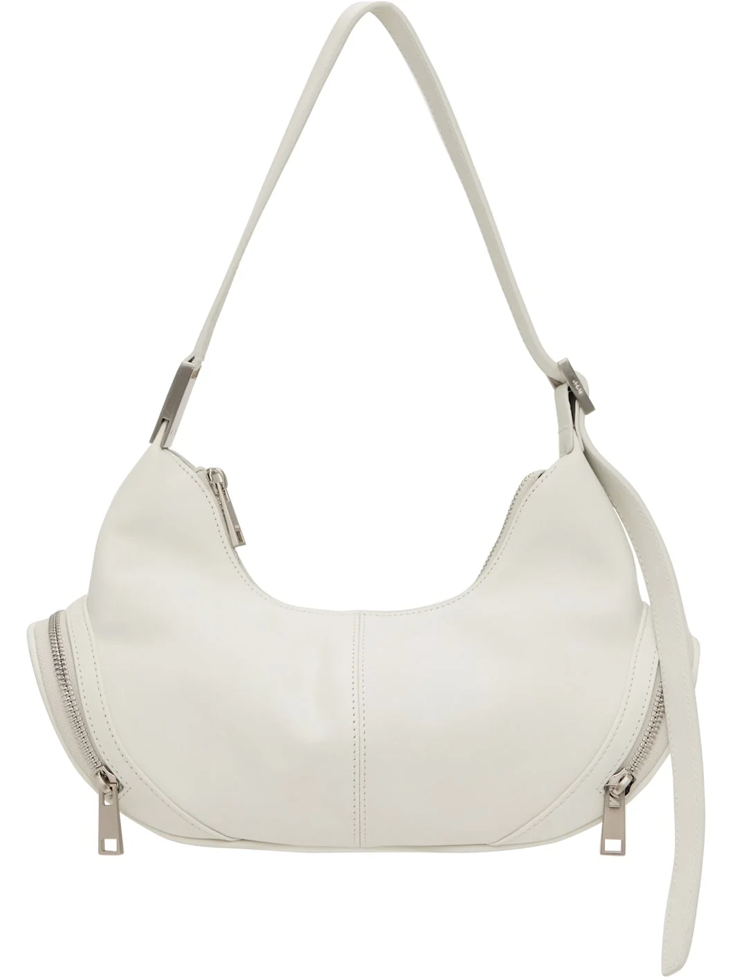 Grained leather shoulder bag in off-white. · Adjustable shoulder strap · Zip pocket at sides · Zip closure · Patch pocket at interior · Microfiber lining · Logo-engraved silver-tone hardware · H6" x W12" x D4" Supplier color: Marena cream Body: 100% leather. Lining: 85% polyester, 15% polyurethane. Made in South Korea 251811F048014