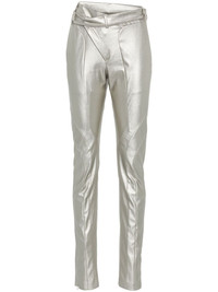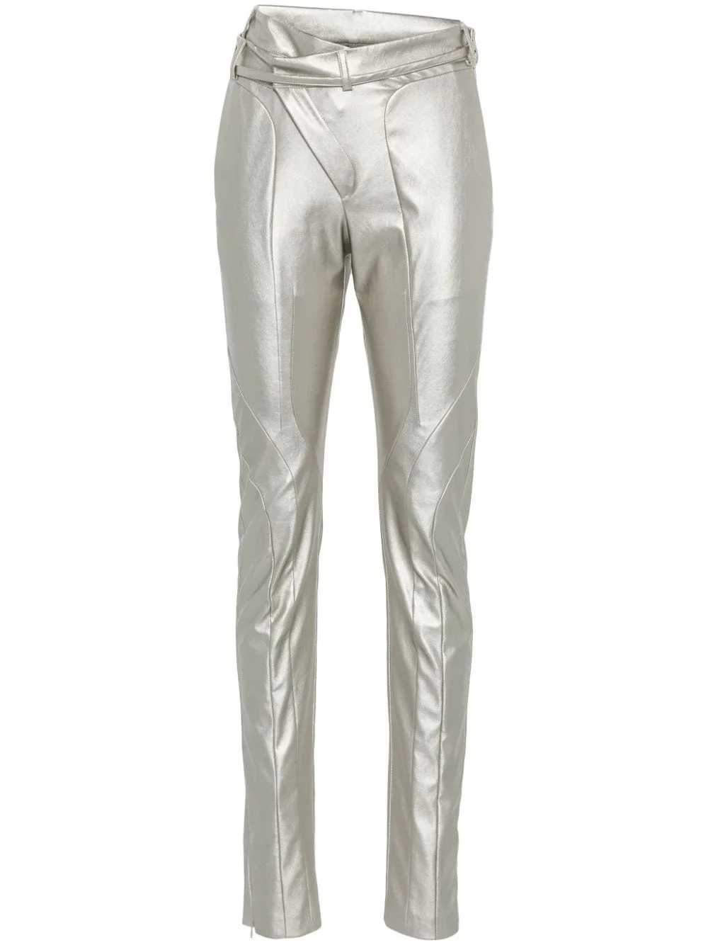 asymmetric waist trousers Highlights - Silver - Asymmetric waist - Belt loops - Self-tie waist fastening - Panelled design - Rear welt pocket - Skinny cut Imported Composition Polyurethane 50%, Polyester 50% SIZE & FIT Model measurements Height 5 ft 9 in(1.76 m) Bust/Chest 31.1 in(79 cm) Hips 36.61 in(93 cm) Waist 24.8 in(63 cm) FittingInformation Designed for a close fit throughout Made from a midweight non-stretch fabric, this piece offers minimal elasticity when worn This piece fits true to size – take your usual size Washing instructions Dry Clean Only