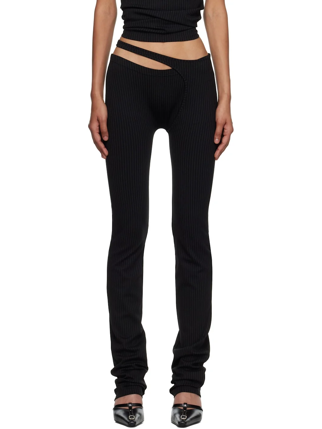 Stretch jersey leggings. · Pinstripes throughout · Cutout at elasticized waistband Supplier color: Black pinstripe 65% rayon, 18% polyamide, 13% polyester, 4% elastane. Made in Greece 252016F085001