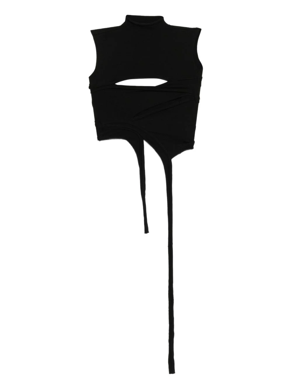 cut out knit top Highlights - Black - Mock neck - Sleeveless - Asymmetric hem Imported Composition Viscose 50%, Polyester 28%, Polyamide 22% SIZE & FIT Model measurements Height 5 ft 9 in(1.76 m) Bust/Chest 32.28 in(82 cm) Hips 35.82 in(91 cm) Waist 25.59 in(65 cm) FittingInformation Designed for a close fit throughout Made from a midweight non-stretch fabric, this piece offers minimal elasticity when worn Washing instructions Hand Wash