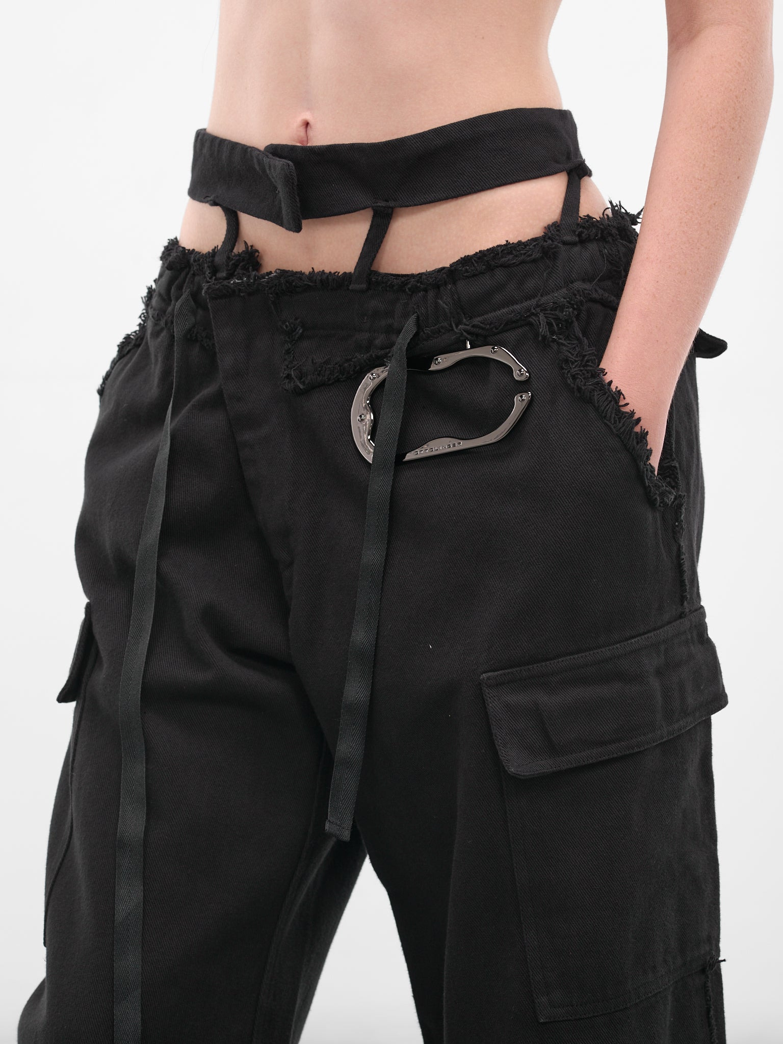 Black cargo trousers in a deconstructed design with a wide-leg baggy cut. Features include offset zip fly, detachable zip panels, adjustable drawstring waist, and multiple cargo pockets. Featuring: • Baggy fit • Deconstructed cargo pants design • High-waisted • Cut-outs and raw hems at waist • Offset zip fly • Silver-tone metal loop with logo engraving • Adjustable drawstring waist • Back logo patch • Side pockets and back flap pockets • Side cargo pockets • Zip detailing at knee • Wide leg • Made in Greece • 100% Cotton • Standard sizing Model is 5'7" wearing size S. Bust: 30" Waist: 22" Hips: 33"