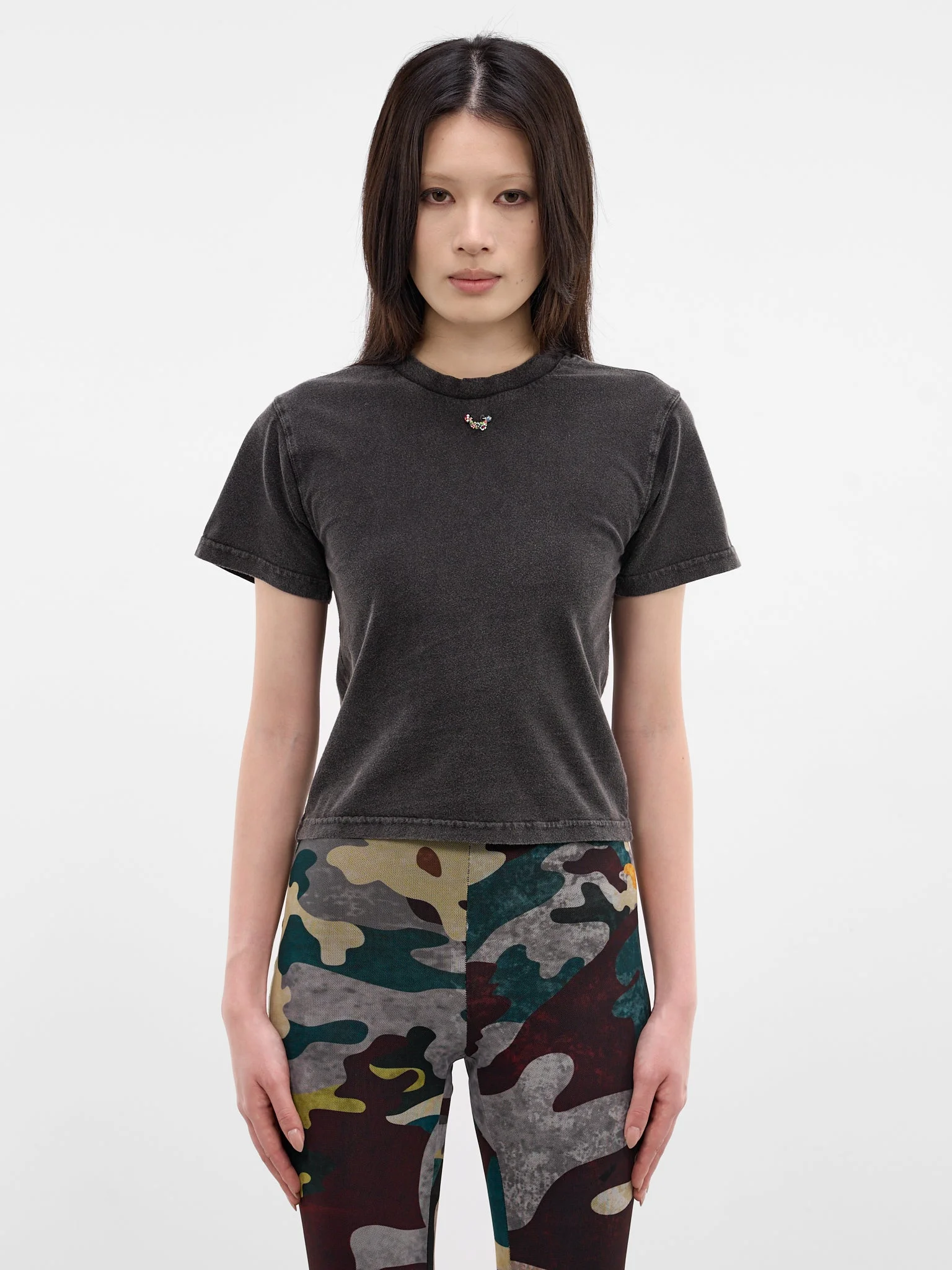 Black organic cotton t-shirt with faded finish and pierced embellishment at front. Featuring: • Slim fit • Cotton construction with faded finish • Crewneck • Pierced embellishment at front • Short sleeves • 100% Organic Cotton • Standard sizing Model is 5'7" wearing size S. Bust: 30" Waist: 24" Hips: 35"