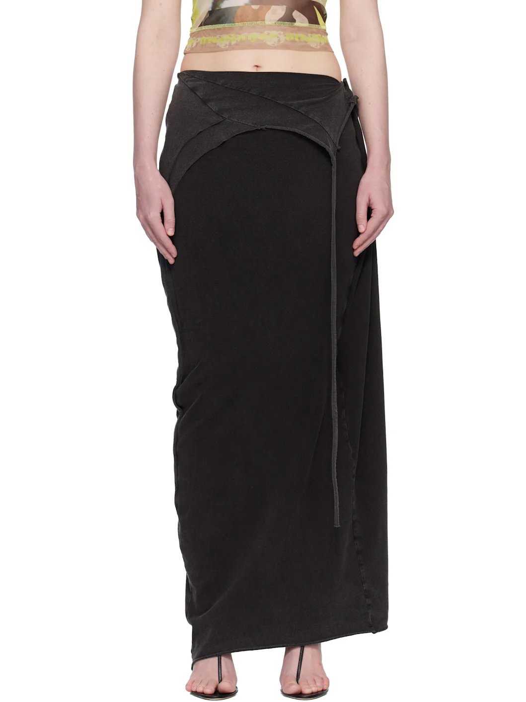 Stretch organic cotton jersey maxi skirt. · Fading throughout · Asymmetric paneled construction · Raw edge at foldover waist and hem · Slit at side seam · Ruching at back waistband Supplier color: Black Wash 97% organic cotton, 3% elastane. Made in Greece 261016F093001
