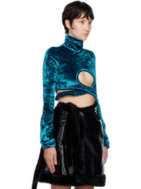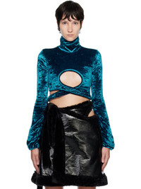 Stretch polyester crushed velour turtleneck. · Keyhole cutout at front · Wraparound self-tie straps at cropped hem · Flared cuffs Supplier color: Blue 90% polyester, 10% elastane. Made in Greece 222016F099003