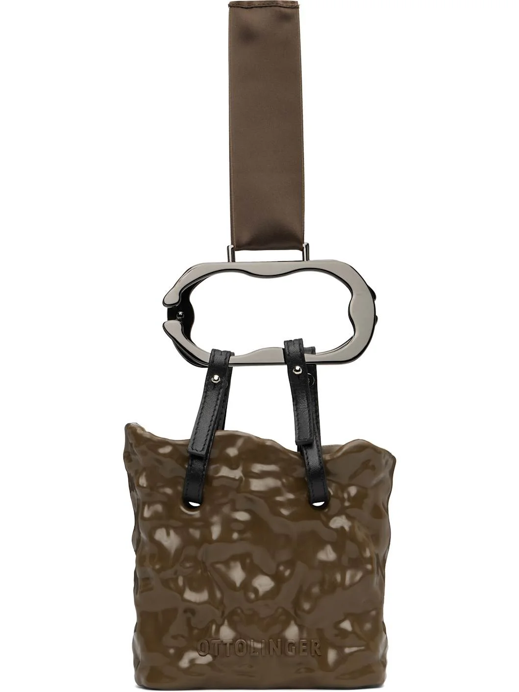 Handcrafted recycled rubber top handle bag. · Satin ribbon at detachable metal carry handles · Leather post-stud straps at collar · Logo embossed at face · Unlined · Logo-engraved gunmetal-tone hardware · H5.5" x W5.75" x D2" Supplier color: Chocolate Thermoplastic polyurethane. Made in Greece 252016F046001