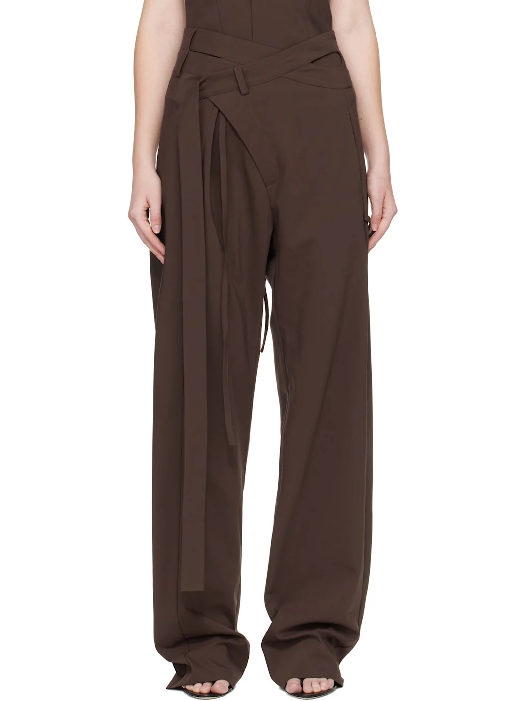 Plain-woven stretch cotton-blend trousers. · Asymmetrical and wrap construction · Belt loops and wraparound straps at waistband · Three-pocket styling · Zip fly · Strap at outseam · Pleat at front Supplier color: Dark brown 62% cotton, 33% polyester, 5% elastane. Made in Greece 252016F087000