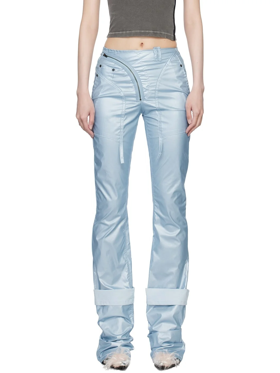 Handcrafted coated stretch recycled polyester twill trousers. · Belt loops · Five-pocket styling · Offset exposed zip-fly · Detachable press-stud panel at legs for alternate styling · Cutout and logo patch at back waistband · Logo flag at back pocket Each item is unique. Please note coloration may vary. Supplier color: Blue 89.5% recycled polyester, 10.5% elastane. Made in Turkey 242016F069006