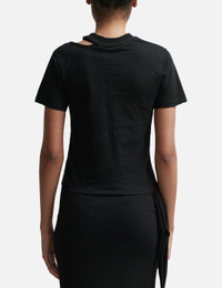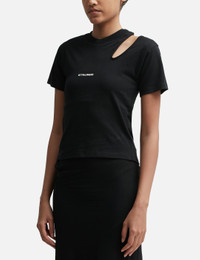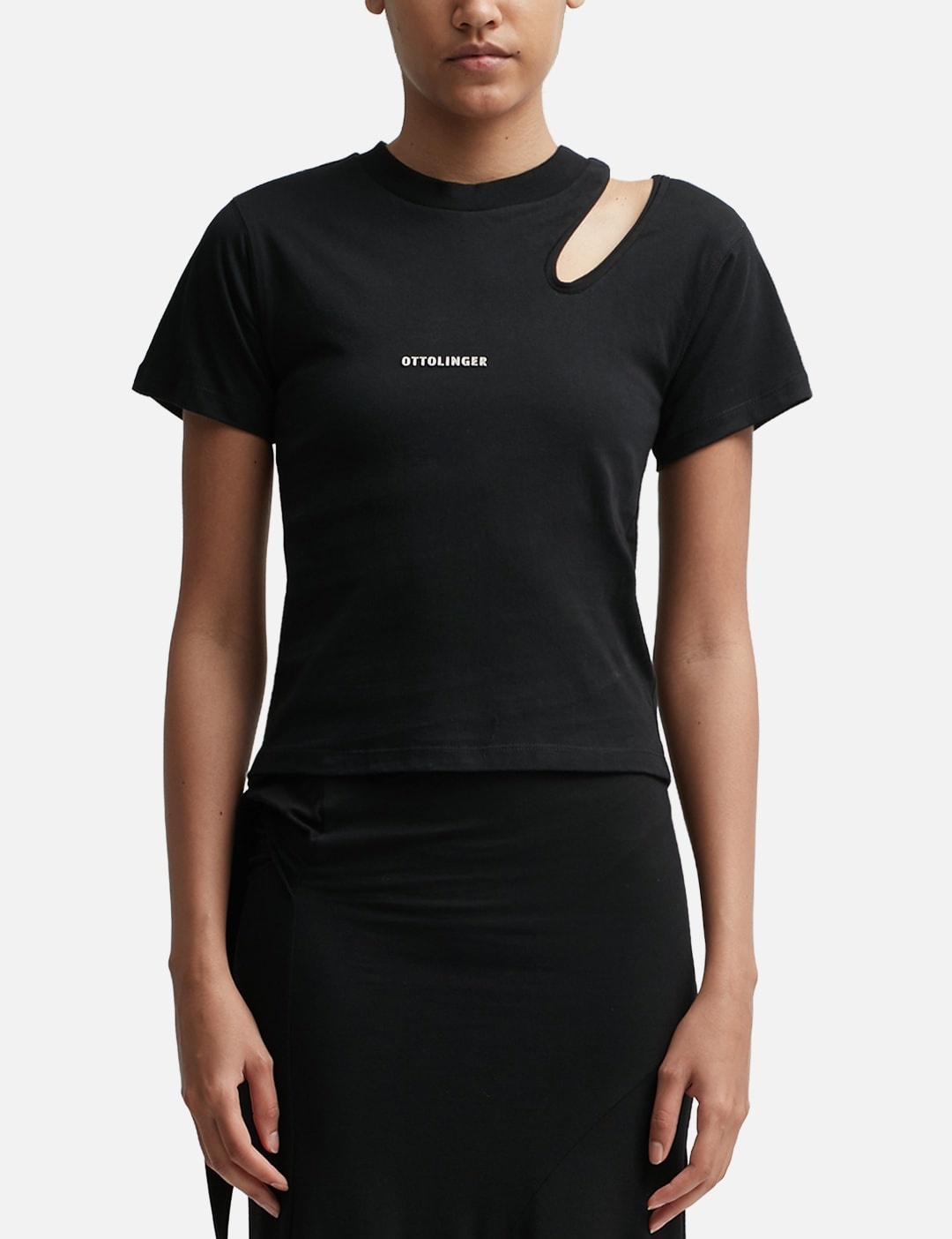 - Ottolinger - Cutout T-Shirt - Slim fit - Crewneck - Short sleeves - Metal branding on the chest - Cut-out details at the shoulder - Straight hem - Color: Black - Material: 100% Organic Cotton - See more Tops and Clothing SIZING - Model wears size XS - Model measures: Height 177cm, Chest 29”/74cm, Waist 23.6”/60cm,Hip 34.6’’/88cm