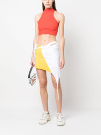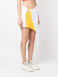 colour-block panelled miniskirt Highlights - White/banana yellow - Stretch-organic cotton - Panelled design - Colour-block panelled design - Silver-tone trim - Asymmetric hem - Elasticated waistband - This item is made from at least 50% organic materials. - Learn more about what makes a product conscious on our conscious criteria page Imported Composition Organic Cotton 97%, Spandex/Elastane 3% SIZE & FIT Model measurements Height 5 ft 11 in(1.8 m) Bust/Chest 31.9 in(81 cm) Hips 35.8 in(91 cm) Waist 24.4 in(62 cm) FittingInformation This mini-length skirt is intended to be worn low on the hips Made from a midweight stretch fabric, this piece offers elasticity and flexibility when worn This piece fits true to size – take your usual size