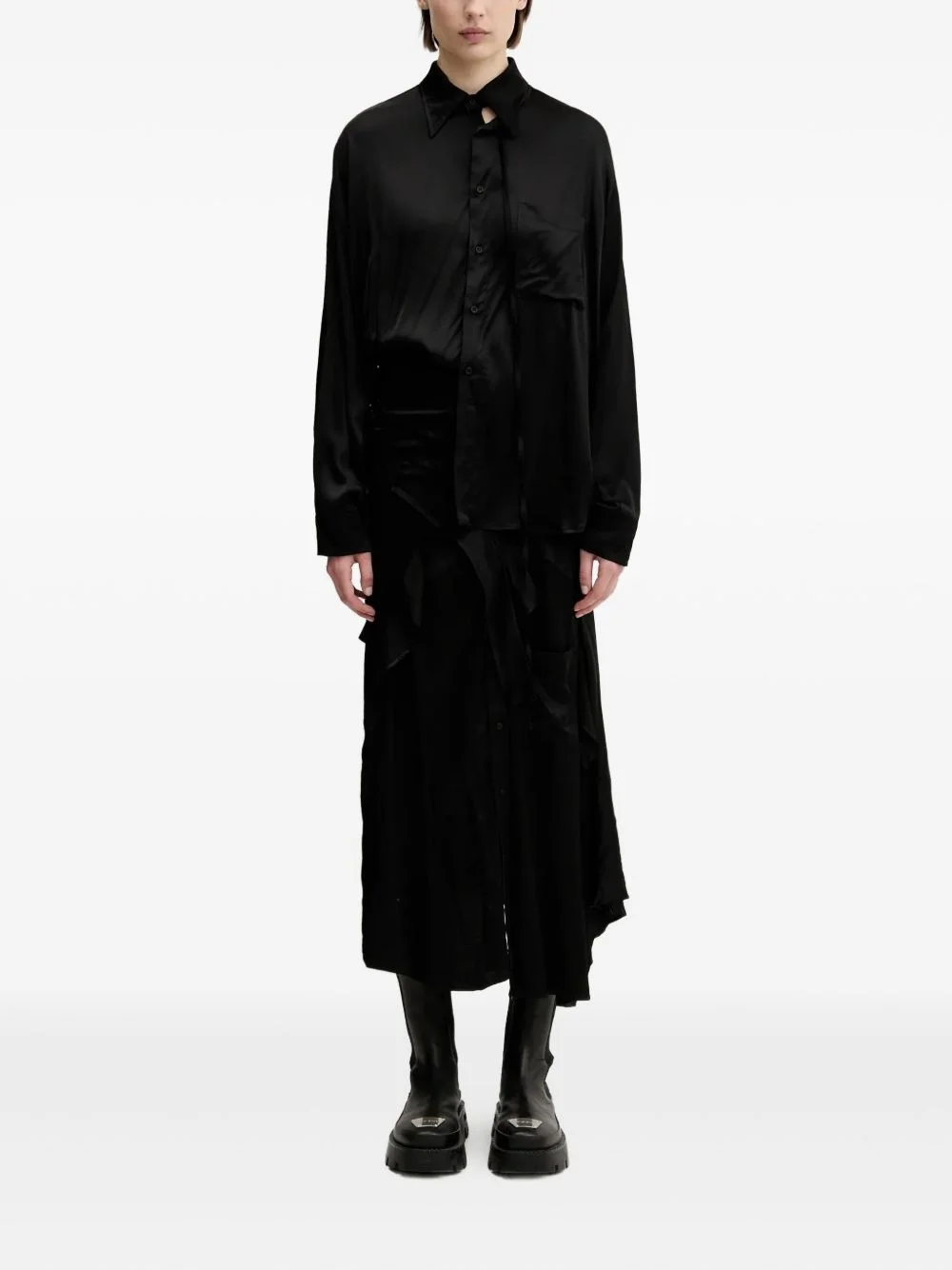 ruffled satin dress Highlights - Black - Ruffled asymmetrical skirt - Keyhole neckline - Cut-out detailing - Long sleeves - Front button fastening Imported Composition Viscose 53%, Rayon 44%, Elastane 3% Washing instructions Read Manufacturer Guidelines