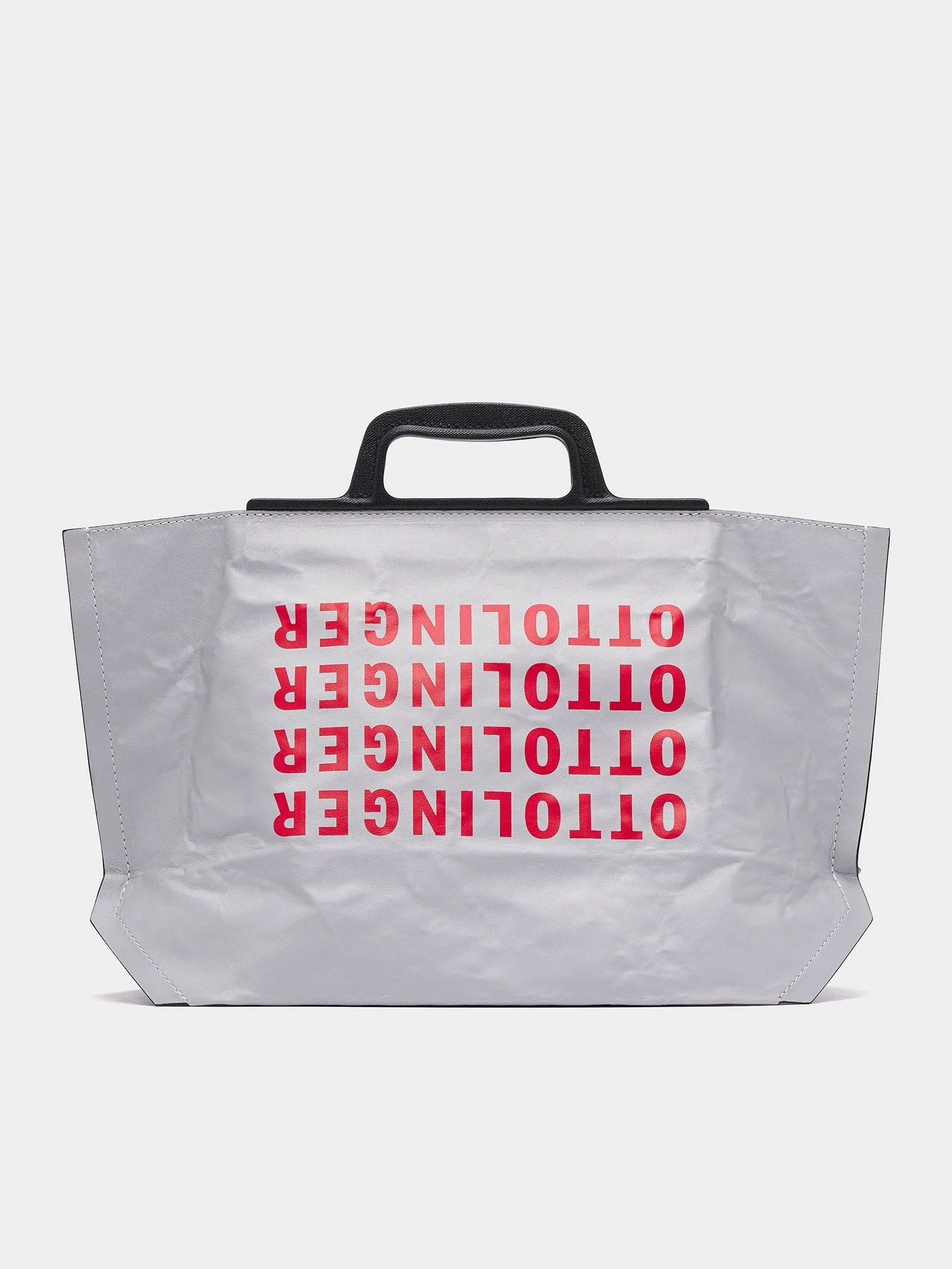 OTTOLINGER x ECCO.KOLLEKTIVE bag in grey & red, shopping bag design, leather construction, printed branding, fixed top handles, tonal topstitching. Made in India 100% Leather One Size